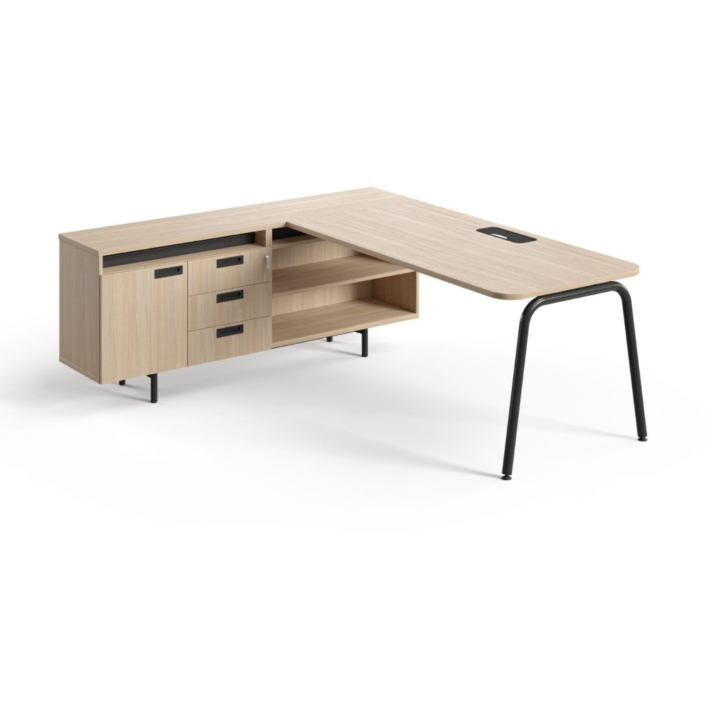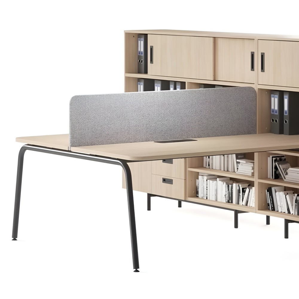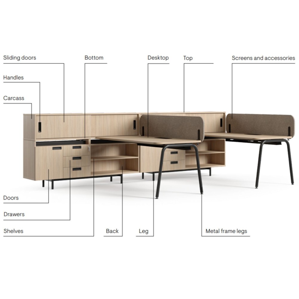Le style est volontairement sobre : lignes nettes, panneaux mélaminés et piètements métal. Les façades intègrent des poignées encastrées, et les éléments de rangement existent avec portes battantes ou portes coulissantes selon la configuration. Les écrans de bureau peuvent être ajoutés pour structurer visuellement les postes.