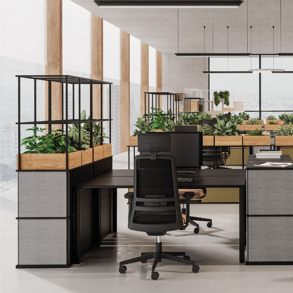 - Options possibles : étagères, boîtes, modules fermés, armoires verrouillables, panneaux acoustiques, suspensions, cintres, assises