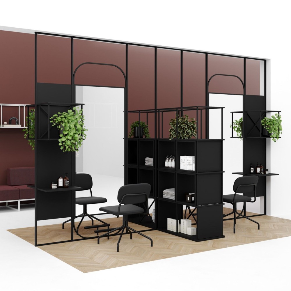 La trame géométrique donne un rendu clair et léger visuellement, même dans un grand volume. La structure est en acier avec une couleur au choix. Tu peux aussi intégrer des éléments bois ou tissu décoratif (en option) pour réchauffer l’ensemble, surtout dans un espace d’accueil.