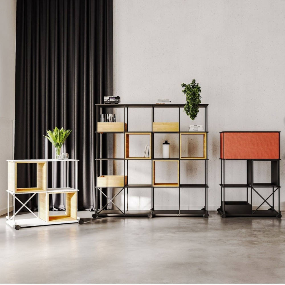 Sa structure géométrique en acier donne un style industriel net, tout en laissant passer la lumière et les regards. Cette conception ouverte évite d’alourdir la pièce et permet de créer une séparation légère entre deux zones. Selon la configuration Saar, tu peux compléter l’ensemble avec différents accessoires de rangement pour adapter le meuble à ton usage.