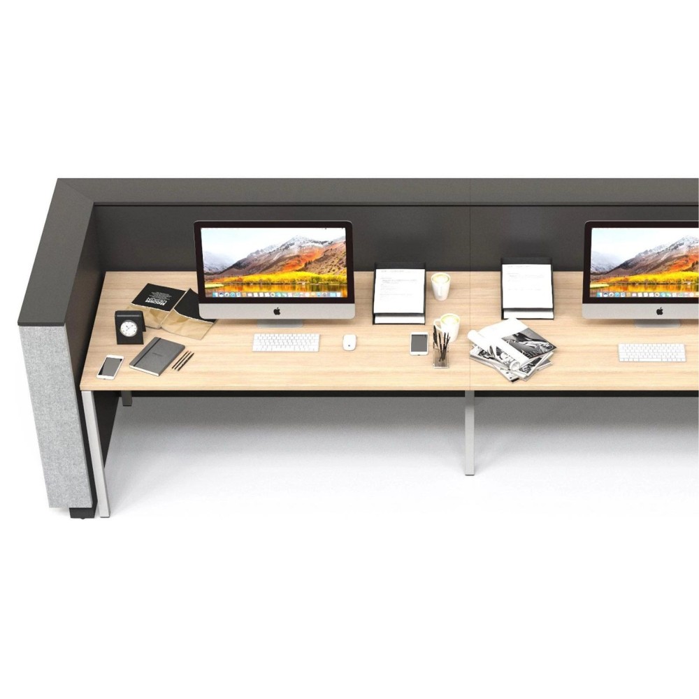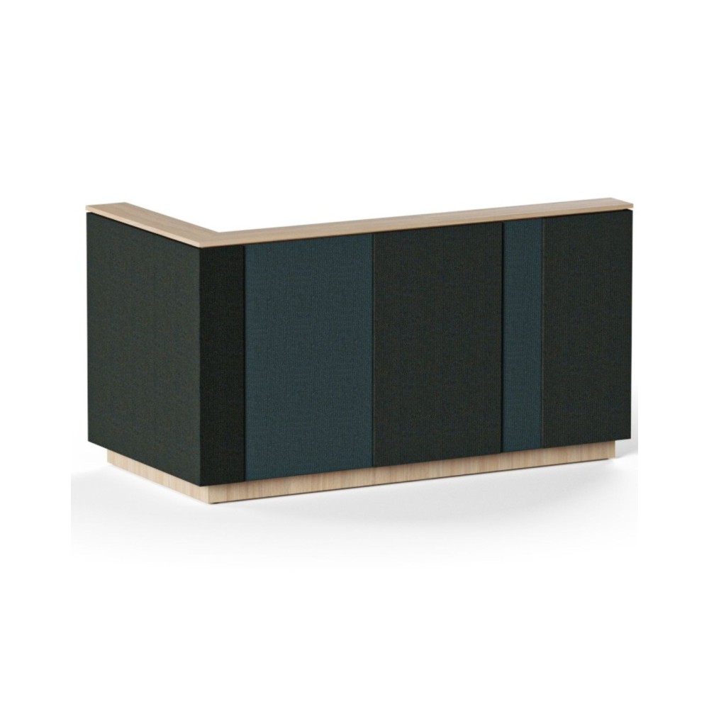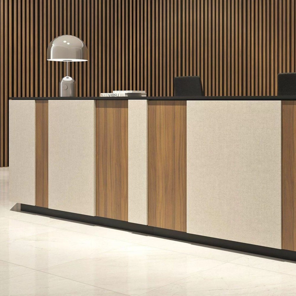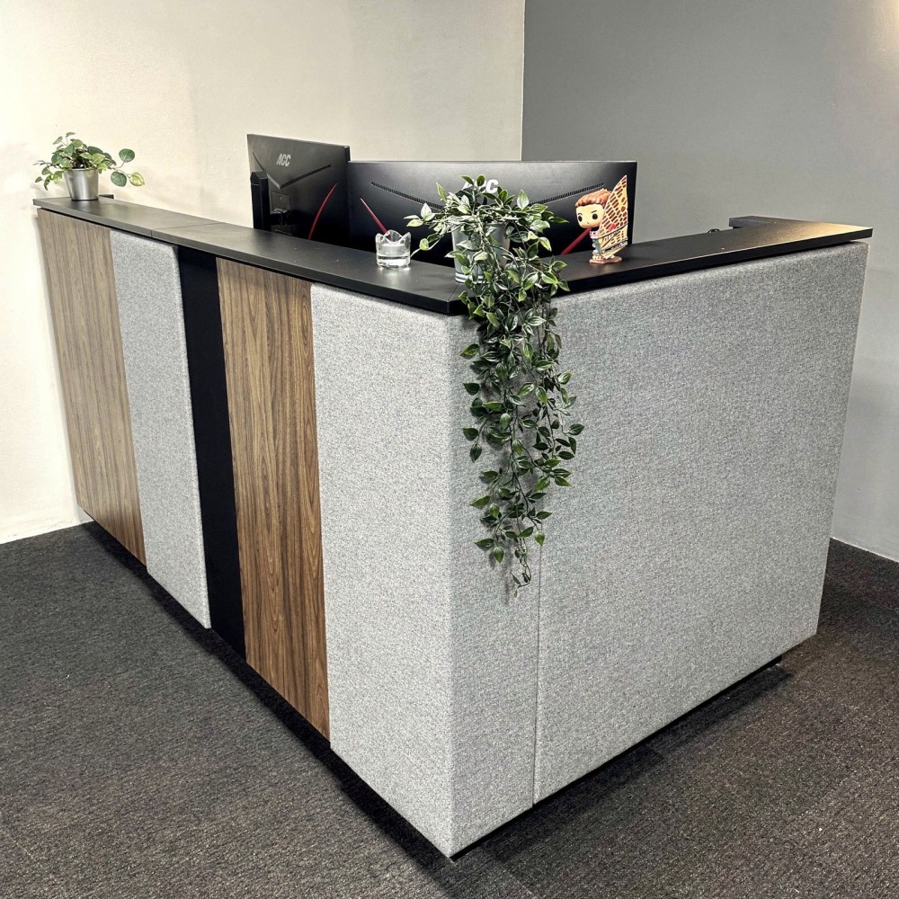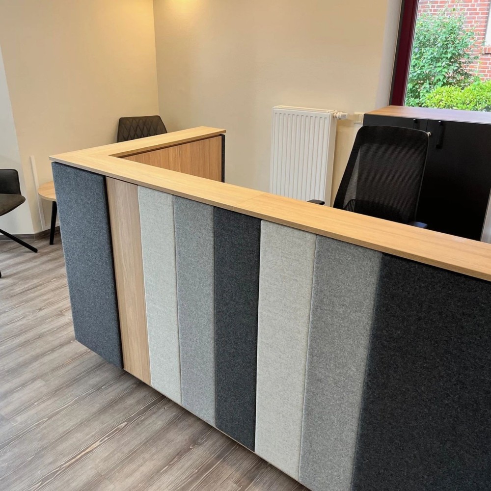 - Pour les entreprises qui veulent un comptoir d’accueil personnalisable avec façade textile, mélaminée ou plaquée