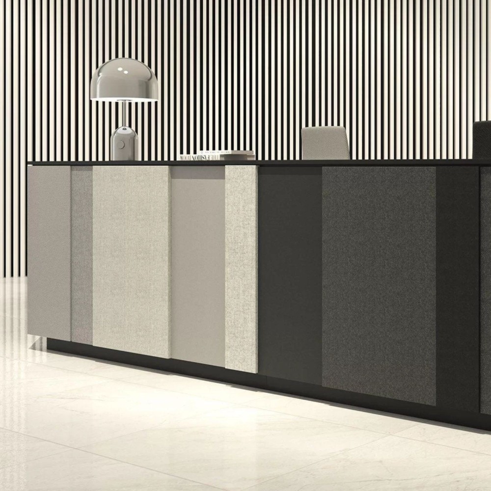 DOMINO existe en forme en L pour gaucher et droitier, ce qui permet d’adapter le comptoir au sens de circulation, à la porte d’entrée ou au placement du poste de travail. La collection se présente comme un système de réception modulaire fondé sur plusieurs bases, plusieurs longueurs et une combinaison libre de panneaux décoratifs. Cela permet de créer une réception plus sobre, plus textile ou plus contrastée selon l’identité du lieu.