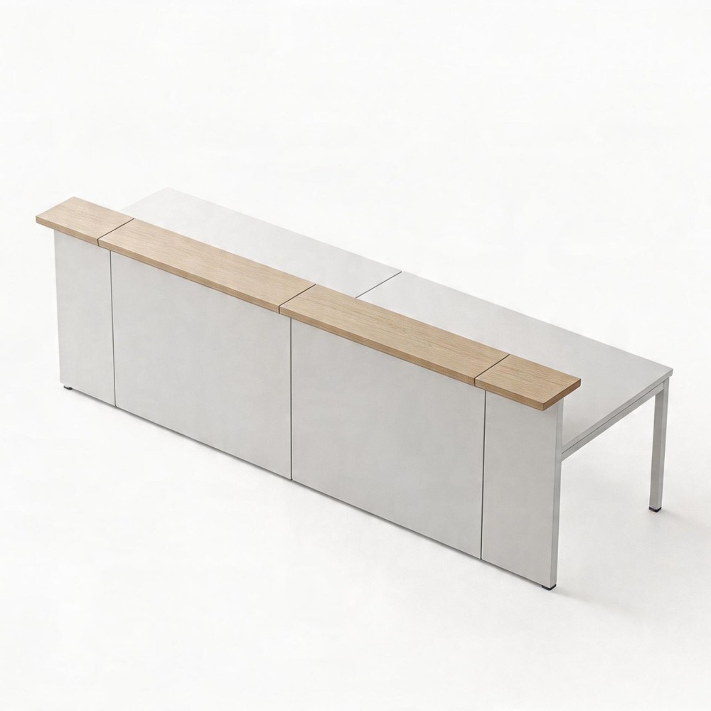 Cette banque d'accueil contient des voiles de fond en mélaminé 18 mm, des dessus en mélaminé 25 mm et des inserts Plexiglas de 6 mm. Le bureau associé, commandé séparément, repose sur une structure métallique thermolaquée avec hauteur de travail de 740 mm. Cet ensemble convient bien aux réceptions où il faut combiner accueil visiteurs, rangement visuel maîtrisé et poste administratif stable.