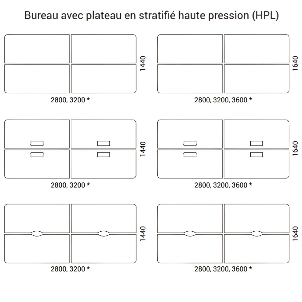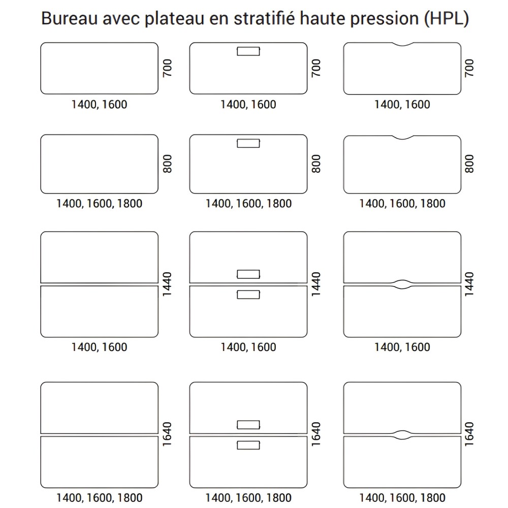 - Profondeurs : 700 mm (poste simple) ; 1440 ou 1640 mm (2 plateaux dos à dos, selon version).