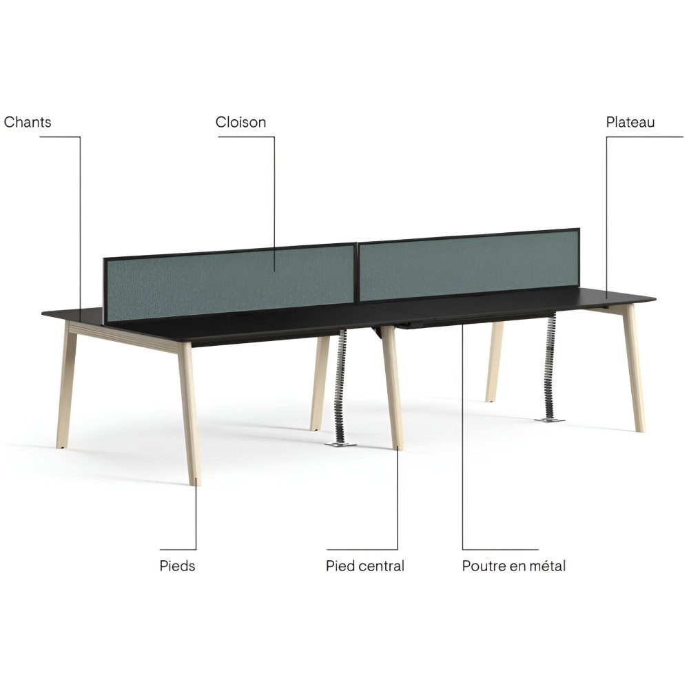 En configuration face à face, chaque utilisateur garde une zone claire. La hauteur standard de bureau et les vérins réglables aident à stabiliser l’ensemble, utile dans des bâtiments tertiaires où le sol n’est pas toujours parfaitement plan. Avec des options de séparation (selon configuration), tu réduis les distractions visuelles et tu cadres mieux les postes.