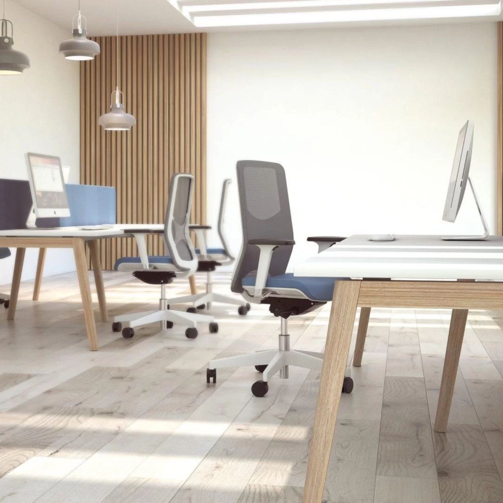 NOVA Wood joue un contraste simple et efficace : pieds inclinés en frêne massif pour le côté chaleureux, et structure métallique en dessous pour une silhouette légère. Le plateau en mélamine ou en HPL est adapté au quotidien bureau et facile d’entretien. Le dessin bench libère l’espace au sol, pratique pour la circulation et le nettoyage sur un plateau de bureaux.