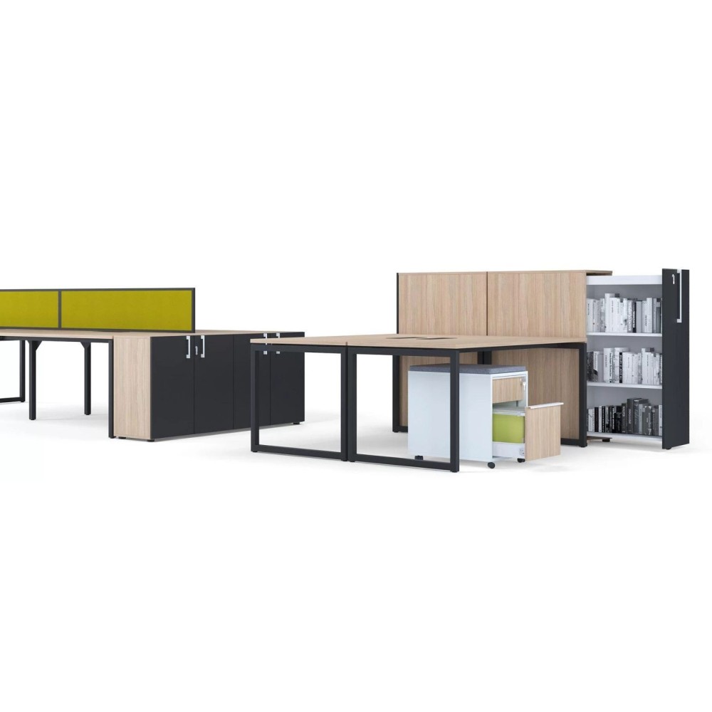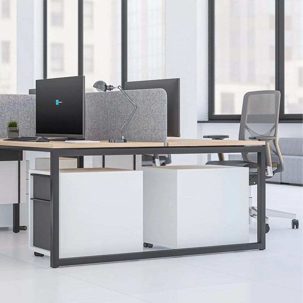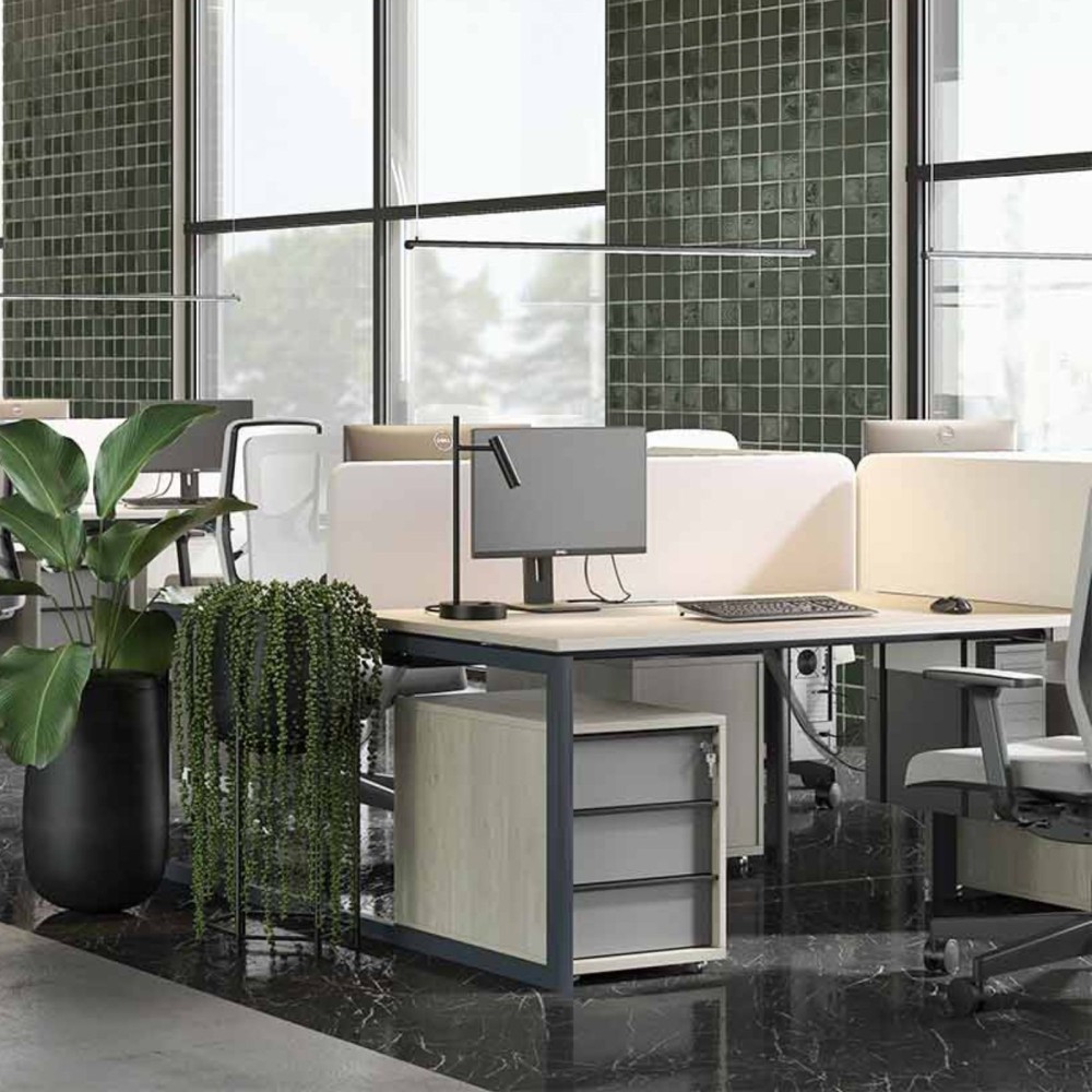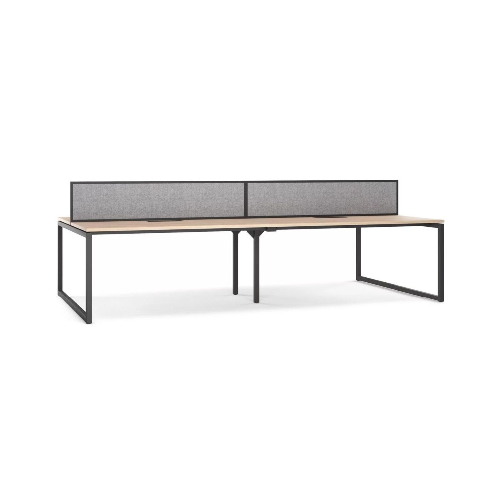 Visuellement, ce bench associe un plateau en mélamine MFC à une structure métal thermolaqué. Le piètement en O apporte une présence graphique discrète et stable. L’ensemble convient bien aux PME suisses, aux bureaux administratifs, aux équipes support ou aux environnements tertiaires qui veulent un mobilier simple à intégrer. Les écrans de séparation visibles sur le visuel renforcent encore la lisibilité des postes et aident à mieux structurer le travail face à face.