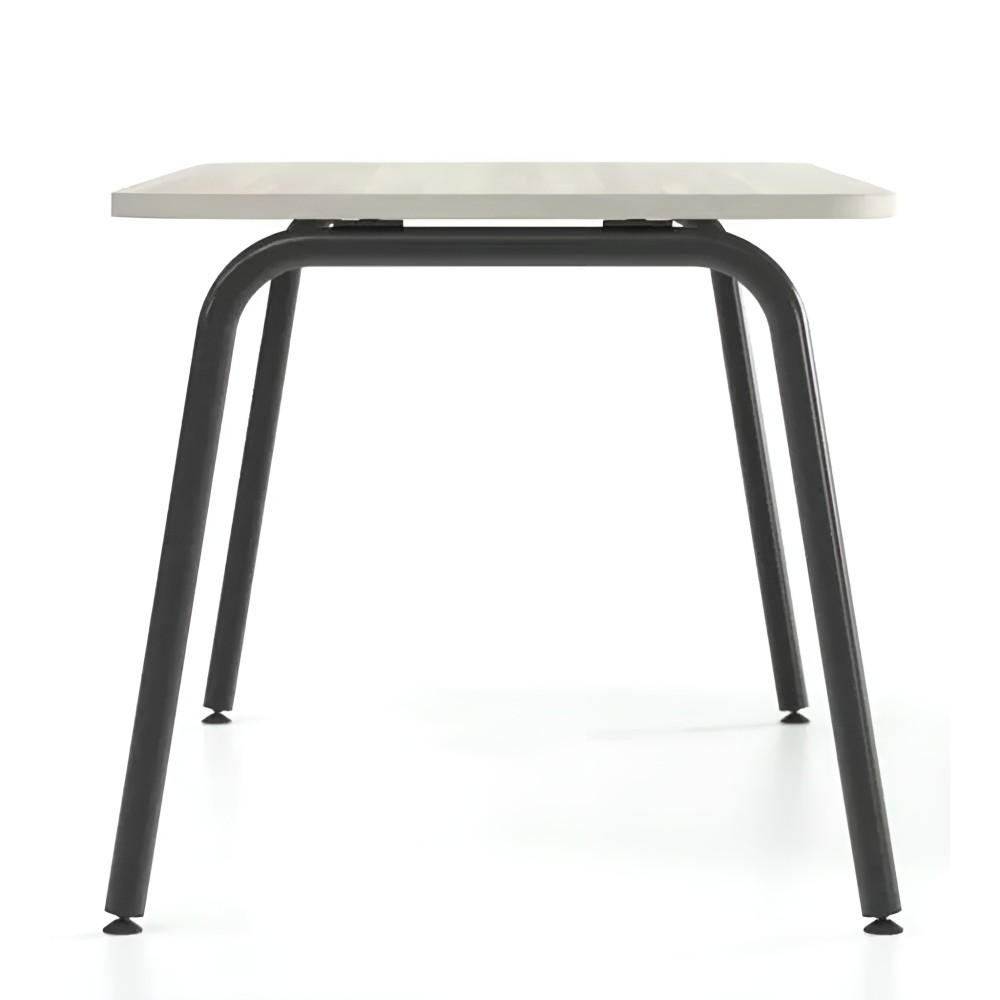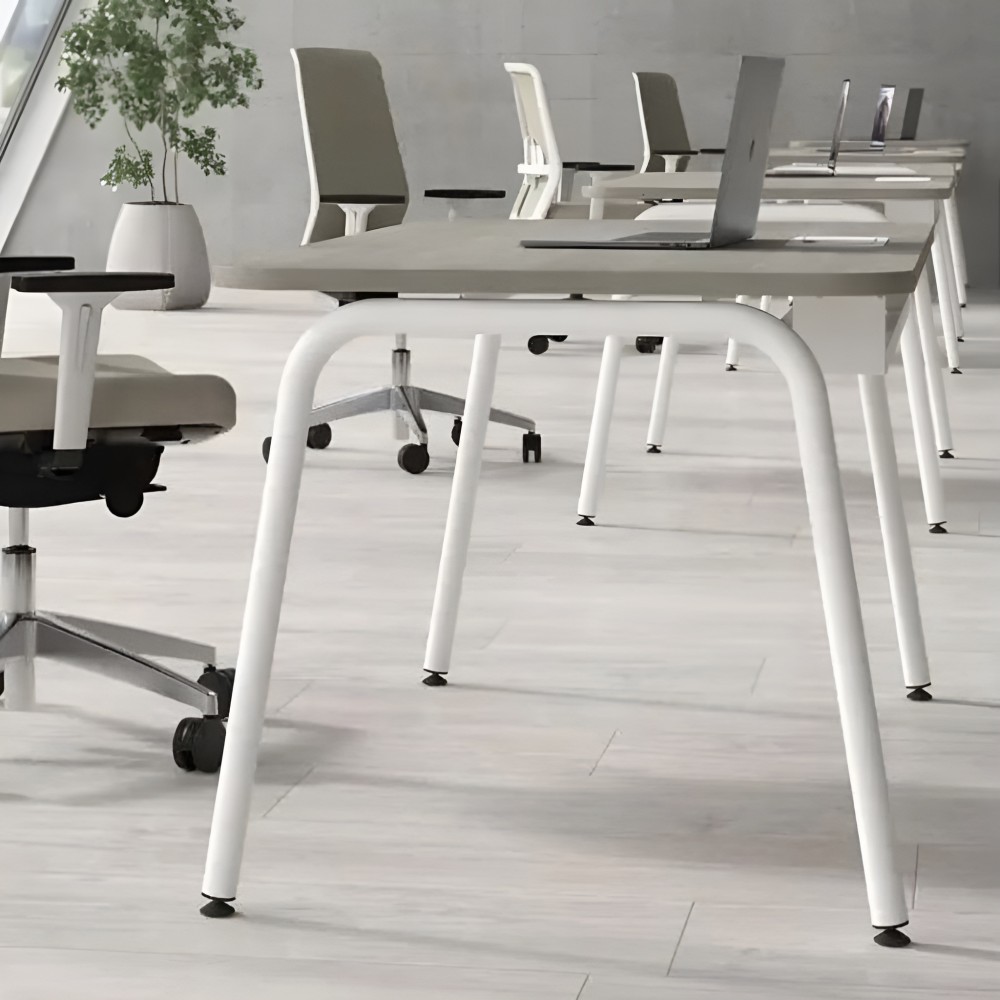 La structure repose sur des pieds tubulaires métalliques en tube rond D40 mm avec finition peinture poudre, ce qui lui donne une silhouette aérée et stable. Le plateau est disponible en mélamine (MFC) 25 mm avec chant ABS 2 mm, ou avec coins arrondis R100 selon la configuration choisie. Le résultat est propre, professionnel et facile à harmoniser avec d'autres mobiliers de bureau.