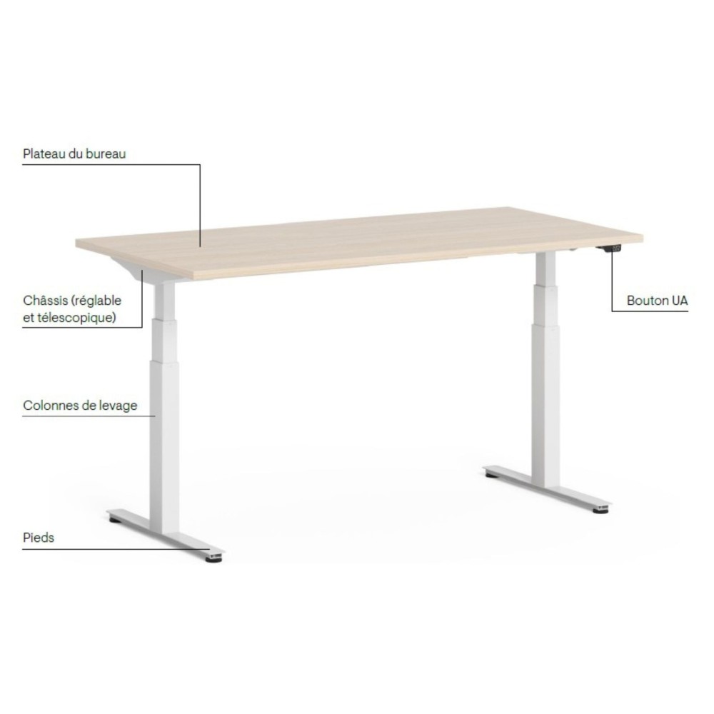 Son châssis télescopique en acier et ses pieds en T donnent une silhouette propre et stable. Le plateau existe en plusieurs finitions (mélaminé ou stratifié), avec des options de découpes pour organiser les câbles. Résultat : un poste net, même quand tu changes souvent de configuration.