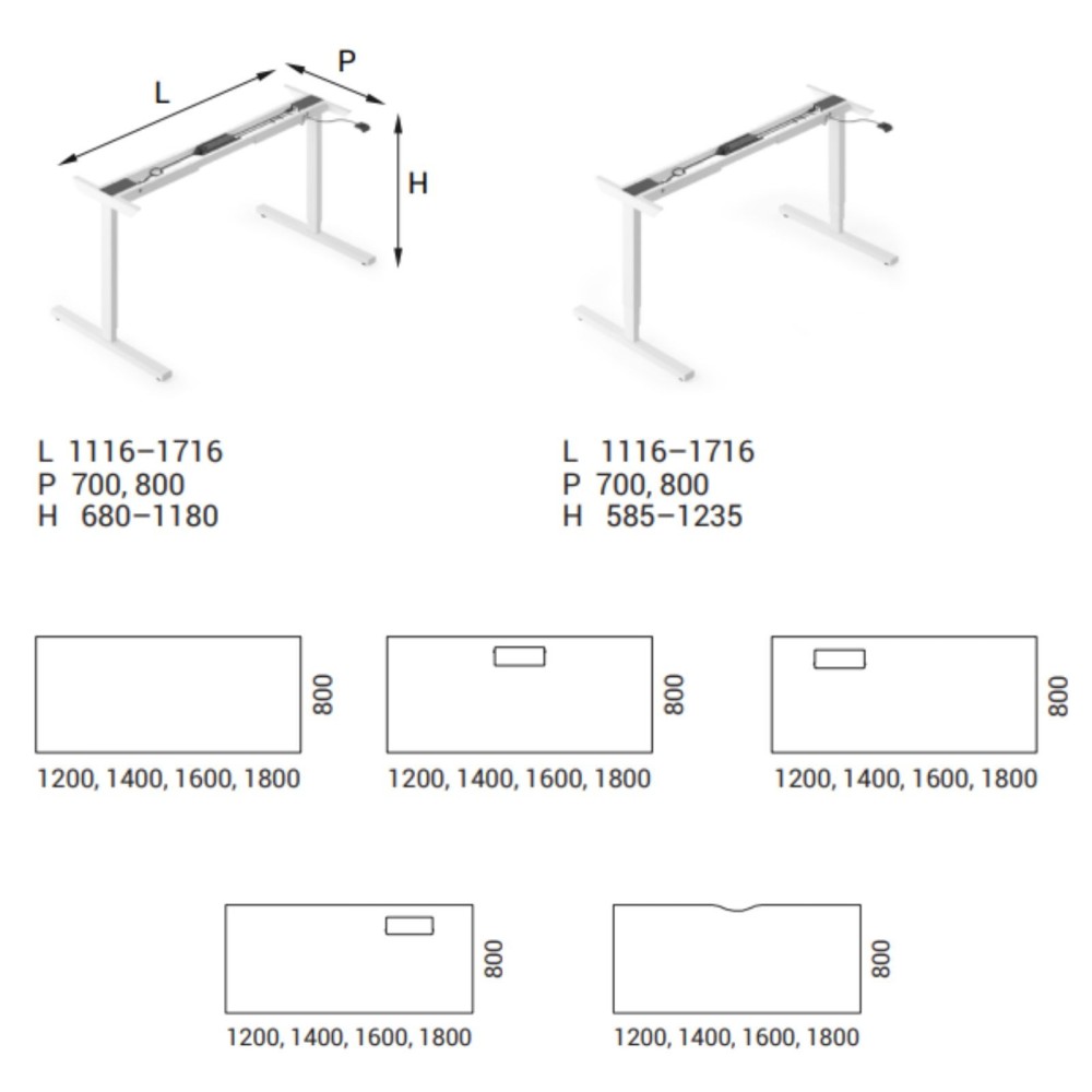 - Hauteur réglable : 680–1180 mm (colonnes DL15) ou 585–1235 mm (colonnes DL16).