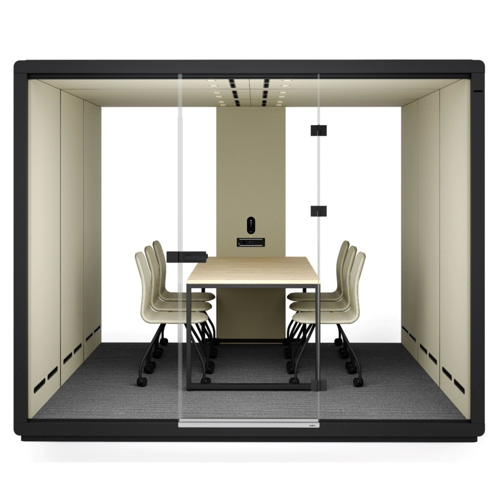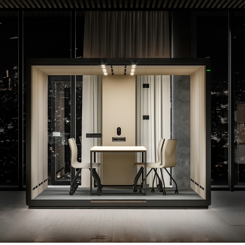 Conçue pour favoriser les échanges, la cabine est équipée d’une table centrale spacieuse de 1900 x 900 mm et peut accueillir jusqu’à six chaises. L’intérieur généreux permet d’organiser facilement des réunions formelles, des sessions de brainstorming ou des présentations client dans une atmosphère calme et productive.