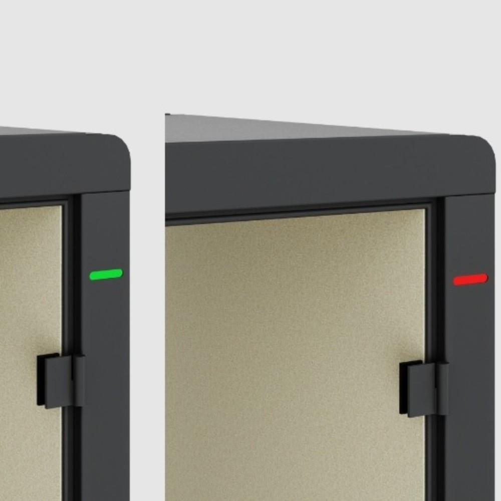 Le panneau de commande tactile offre un contrôle précis de la lumière et de la ventilation. L’indicateur lumineux extérieur (rouge/vert) indique en temps réel la disponibilité de la cabine. Des ports multimédias intégrés et un chargeur sans fil (en option) garantissent une connectivité fluide pour tous les participants.