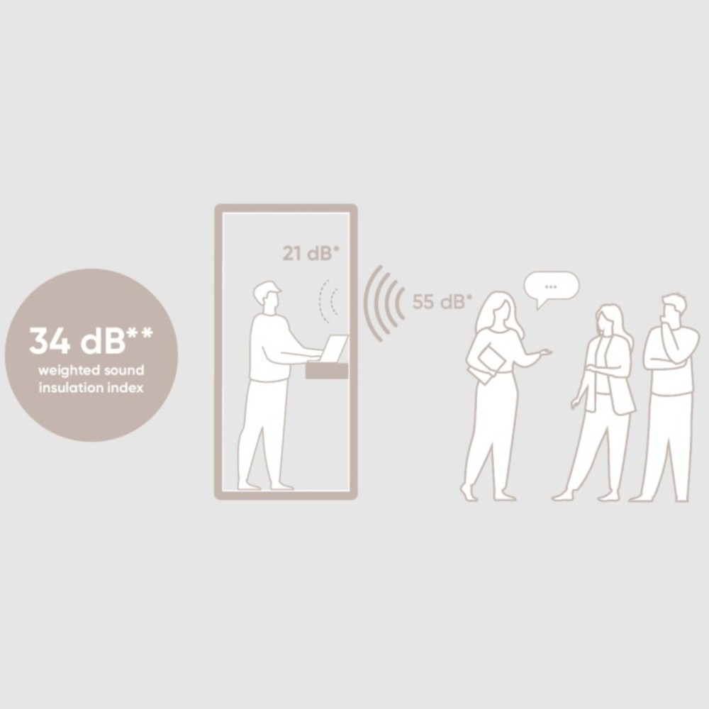 Conforme à la classe A selon la norme ISO 3382-3:2012, la cabine Flathouse offre une isolation phonique de très haut niveau. Grâce à des matériaux absorbants de qualité et à une conception structurelle précise, elle réduit efficacement le bruit de la parole, assurant confidentialité et sérénité.