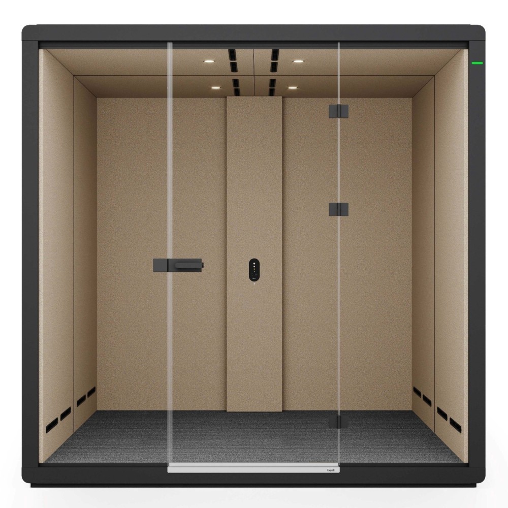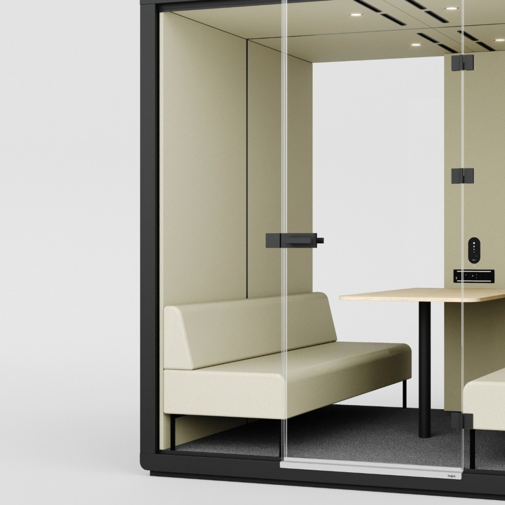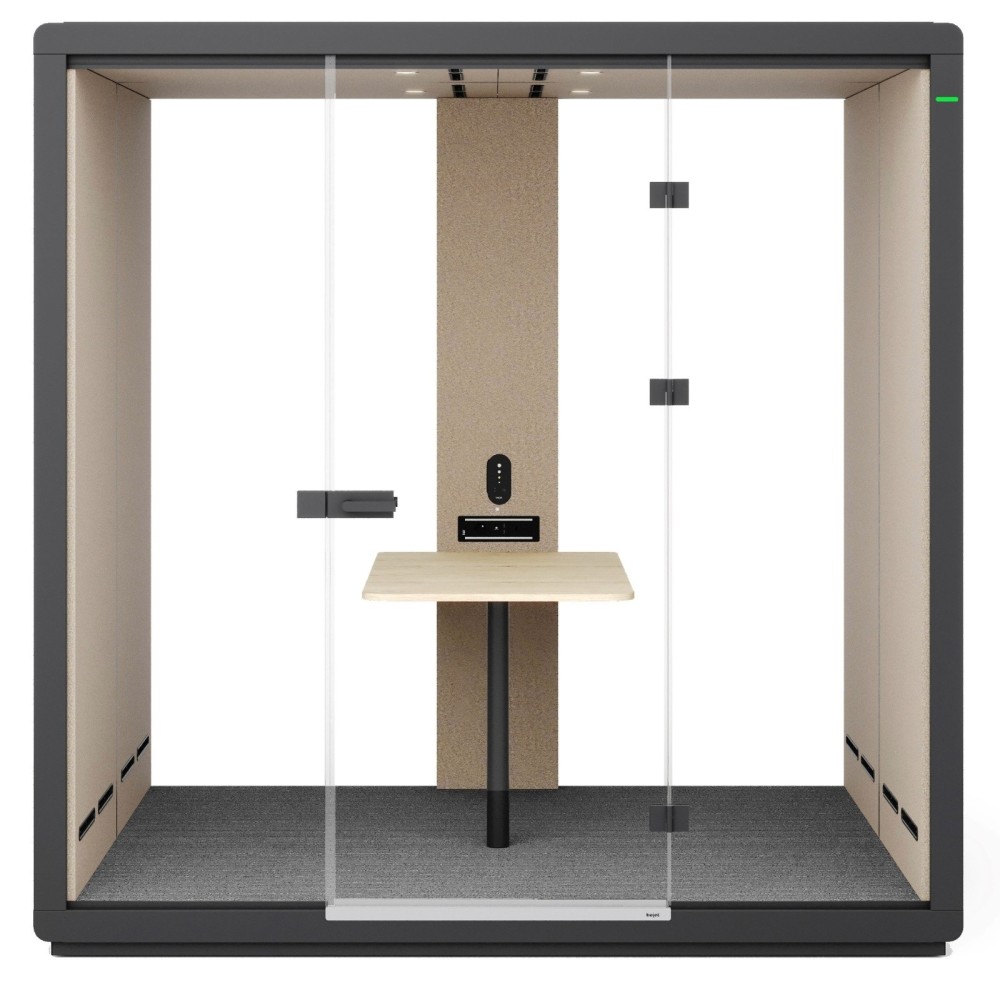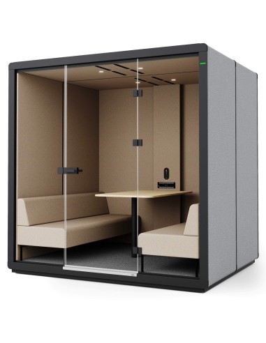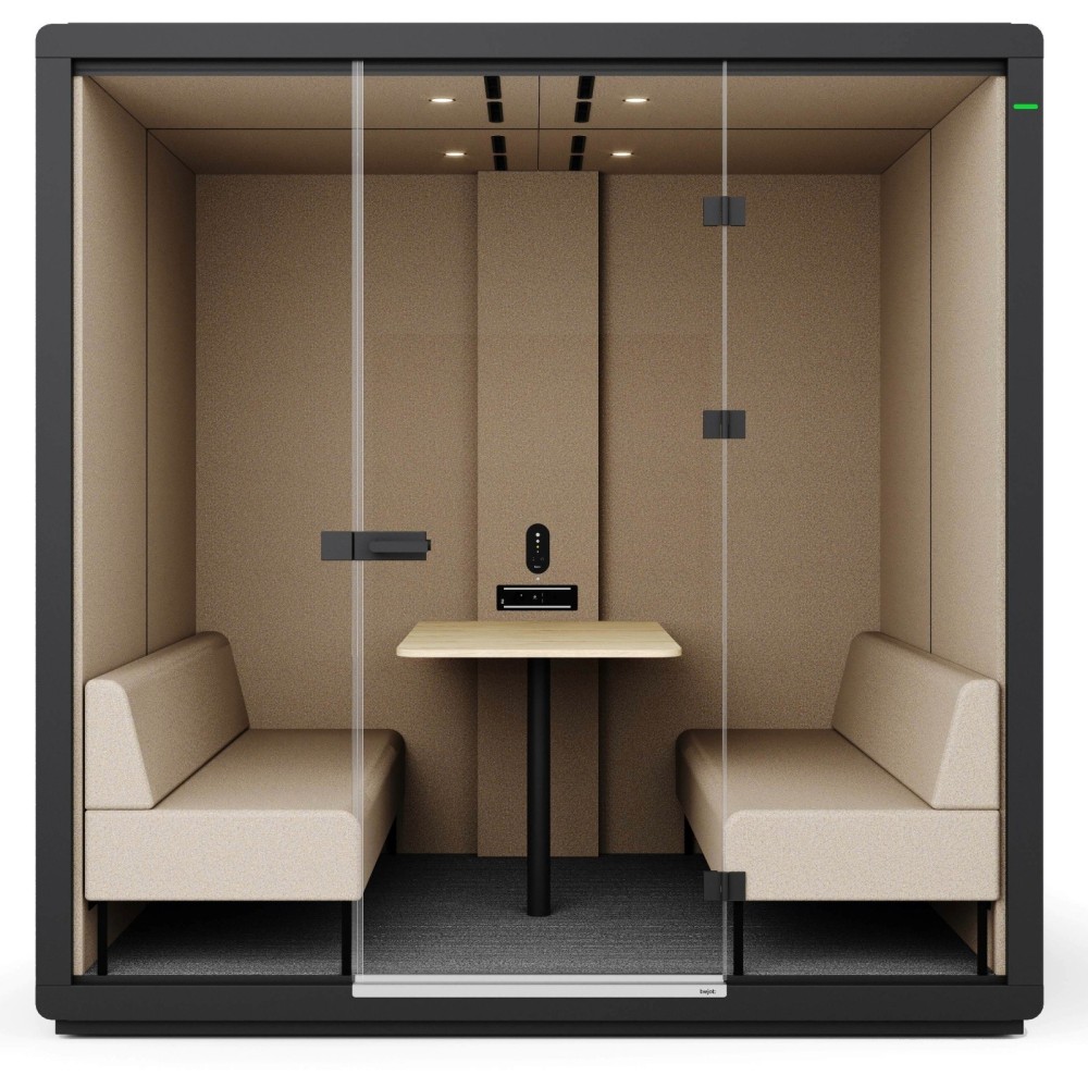 La cabine est équipée de deux larges banquettes tapissées se faisant face et d’une table centrale spacieuse, offrant un confort optimal pour quatre utilisateurs. Cet aménagement favorise les échanges collaboratifs, les entretiens et les réunions en petit comité. L’éclairage LED intégré et la ventilation silencieuse se déclenchent automatiquement grâce à un capteur de mouvement, assurant un confort immédiat à chaque utilisation.