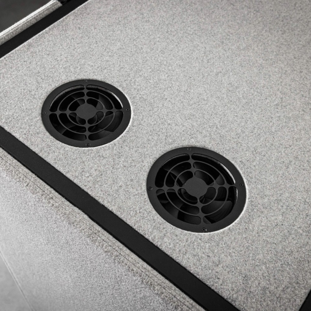 La cabine est équipée d’un système d’éclairage LED basse consommation et d’une ventilation double flux silencieuse. Grâce à un capteur de mouvement intégré, la lumière et le renouvellement d’air s’activent automatiquement dès que l’utilisateur entre dans la cabine. Le débit d’air a été étudié pour garantir un confort constant, même lors d’une utilisation prolongée.