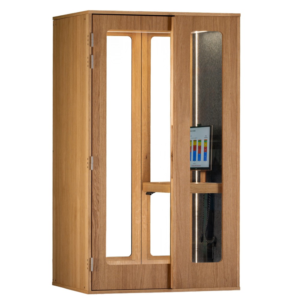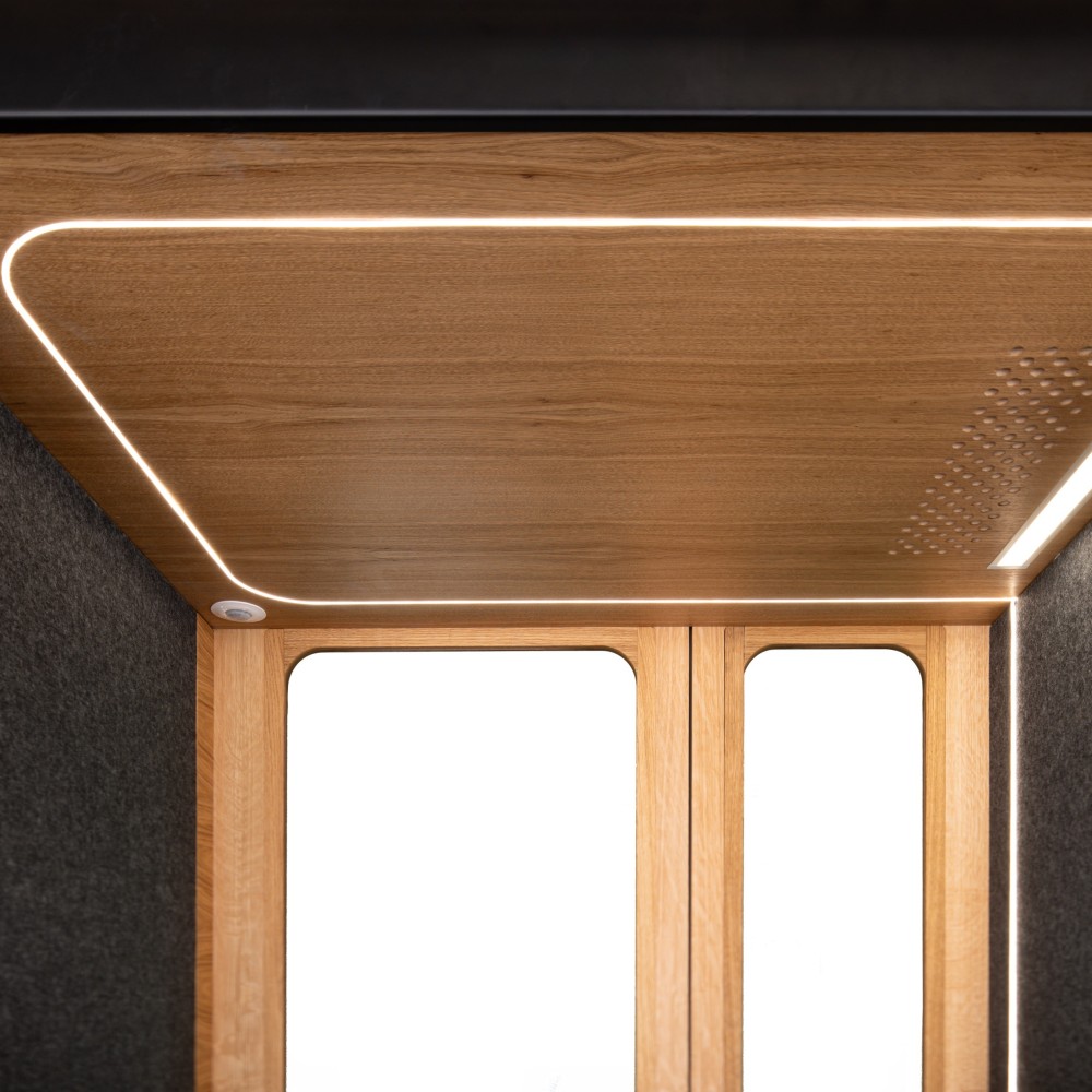 La cabine acoustique Haven Focus est proposée exclusivement avec une finition placage chêne naturel, apportant chaleur, élégance et intégration parfaite dans les environnements professionnels contemporains.