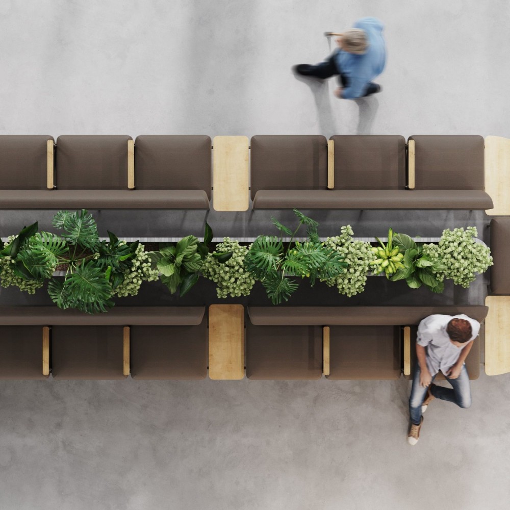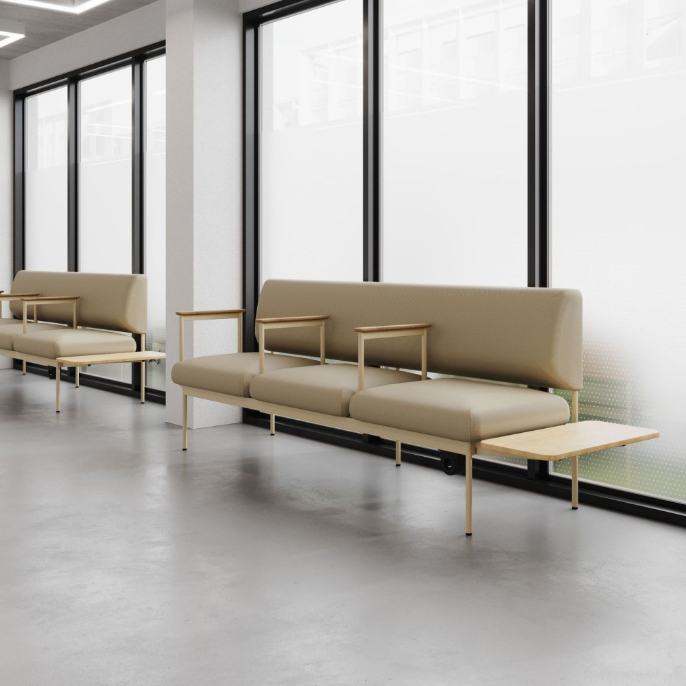 Le canapé 3 places Fora Care peut être configuré avec différents éléments (tablettes, accoudoirs, prises électriques ou USB en option). Cela permet de créer des aménagements adaptés aux besoins spécifiques des espaces d’attente, coworkings, zones lounge ou établissements de santé.