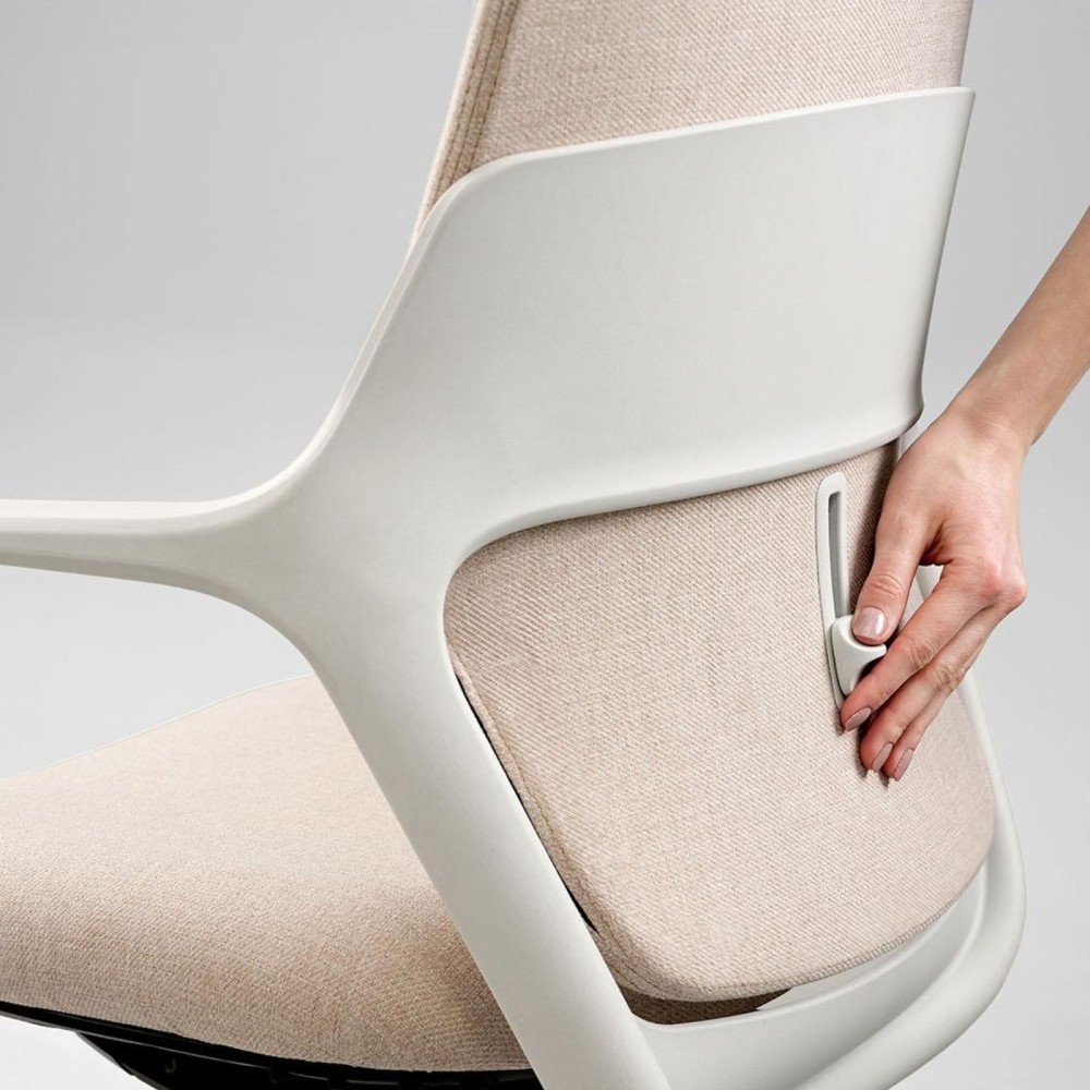 Avec une hauteur de dossier d’environ 355 mm, ce modèle OFY est idéal pour les utilisateurs recherchant un fauteuil discret visuellement, qui facilite les échanges, les mouvements rapides et l’agencement flexible des postes. Le rembourrage souple épouse naturellement le bas du dos, assurant un maintien confortable pendant les réunions ou les phases de travail alternées (assis - debout).