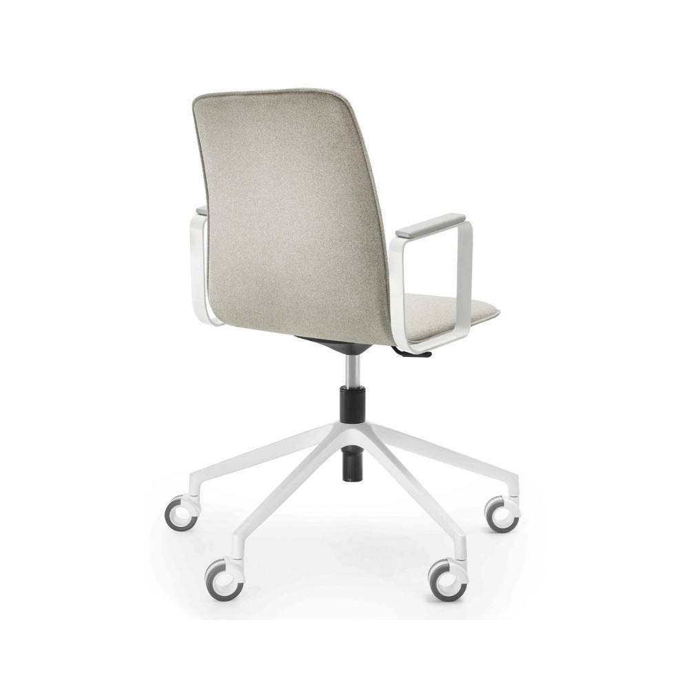 Son assise tapissée aux lignes sobres, associée à une base mobile à 5 roulettes et à un mécanisme de réglage en hauteur, en fait une solution fonctionnelle et élégante pour les environnements professionnels contemporains.