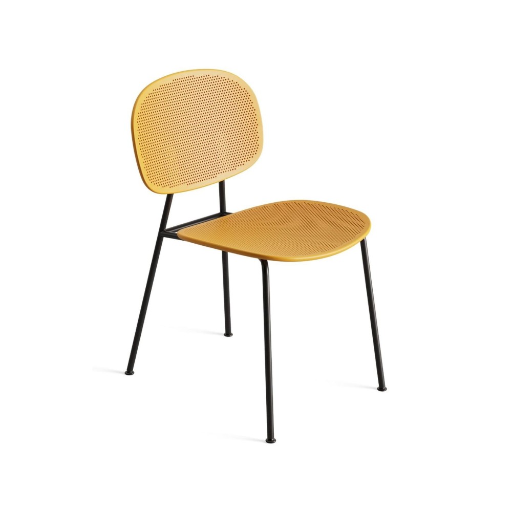 La structure en acier peint résiste parfaitement aux conditions extérieures. L’assise et le dossier en plastique ajouré permettent une évacuation rapide de l’eau, évitant toute stagnation. La surface se nettoie facilement, ce qui en fait un mobilier parfait pour une utilisation en hôtellerie, restauration ou collectivité.
