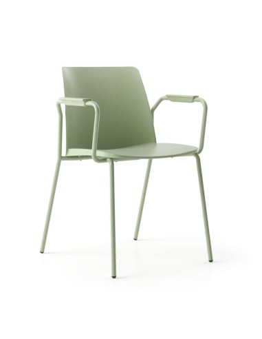 Le coloris vert pastel de la coque s’accorde parfaitement avec le piètement métallique assorti. L’ensemble monochrome confère un rendu visuel sobre et professionnel, idéal pour les aménagements contemporains et les lieux publics élégants.