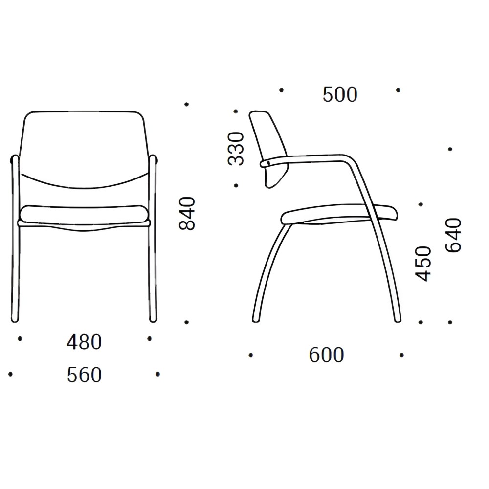 Hauteur totale : 840 mm – Largeur d’assise : 480 mm – Profondeur : 600 mm – Hauteur d’assise : 450 mm – Hauteur des accoudoirs : 630 mm. -