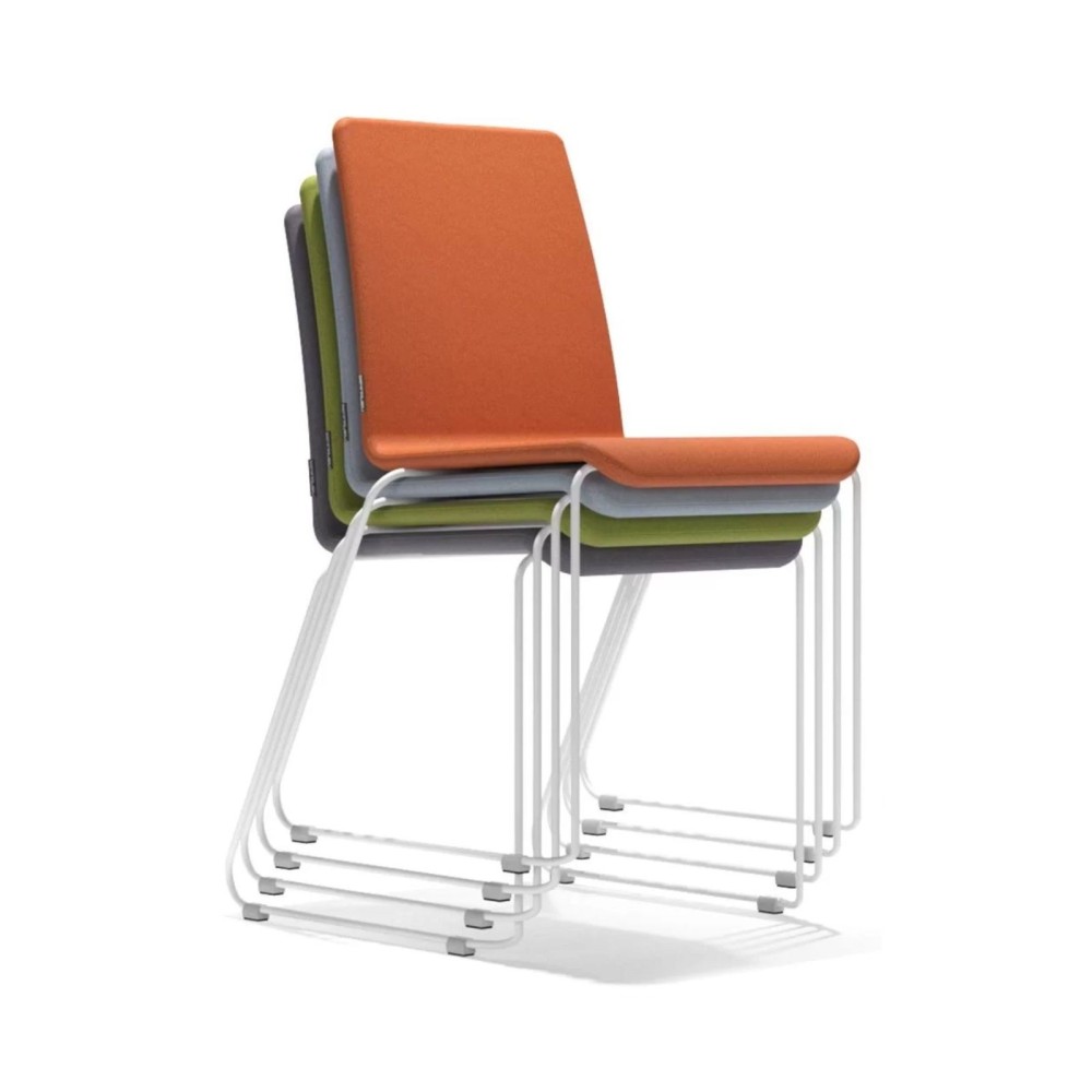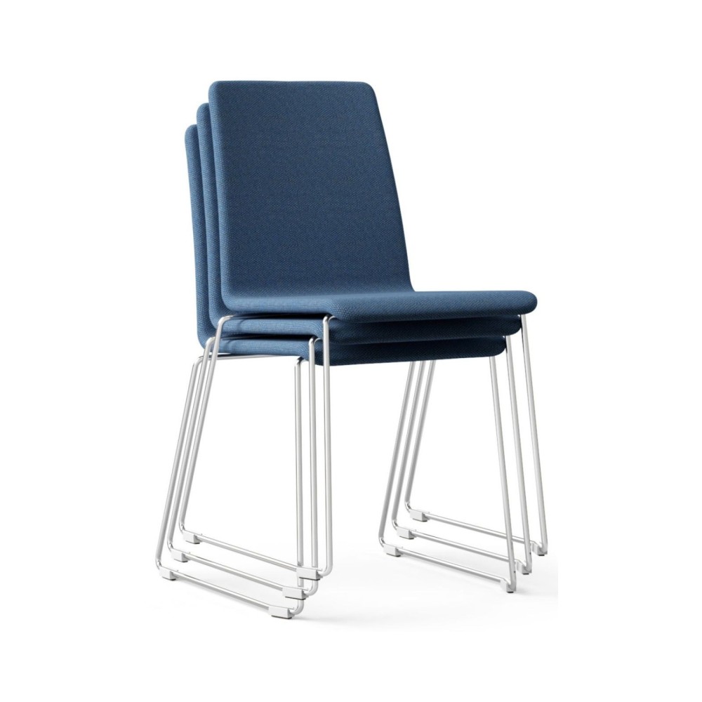 Le piètement traîneau en acier Ø11 mm assure une bonne stabilité tout en apportant une touche graphique et légère. Il permet aussi un empilage facile pour optimiser le rangement.