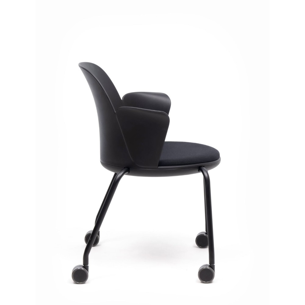 Ce modèle fait partie de la collection Haali ECO, conçue à partir de matériaux recyclés : 50 % post-industriels et 50 % post-consommation. La coque injectée en plastique renforcé de fibre de verre assure souplesse, résistance à l’usage intensif et confort durable. L’assise est ici rembourrée pour un confort optimal, même lors de longues réunions.