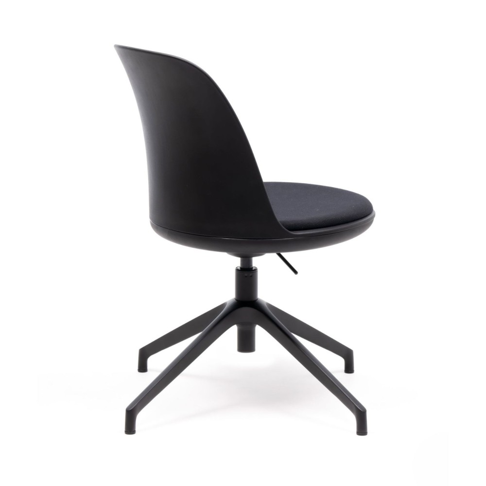 Son piétement 4 branches rotatif en aluminium, disponible en finition chromée ou thermolaquée, assure une parfaite stabilité tout en permettant une rotation fluide à 360°. Grâce à son mécanisme pivotant et réglable en hauteur, cette chaise s’adapte à toutes les morphologies et hauteurs de table.