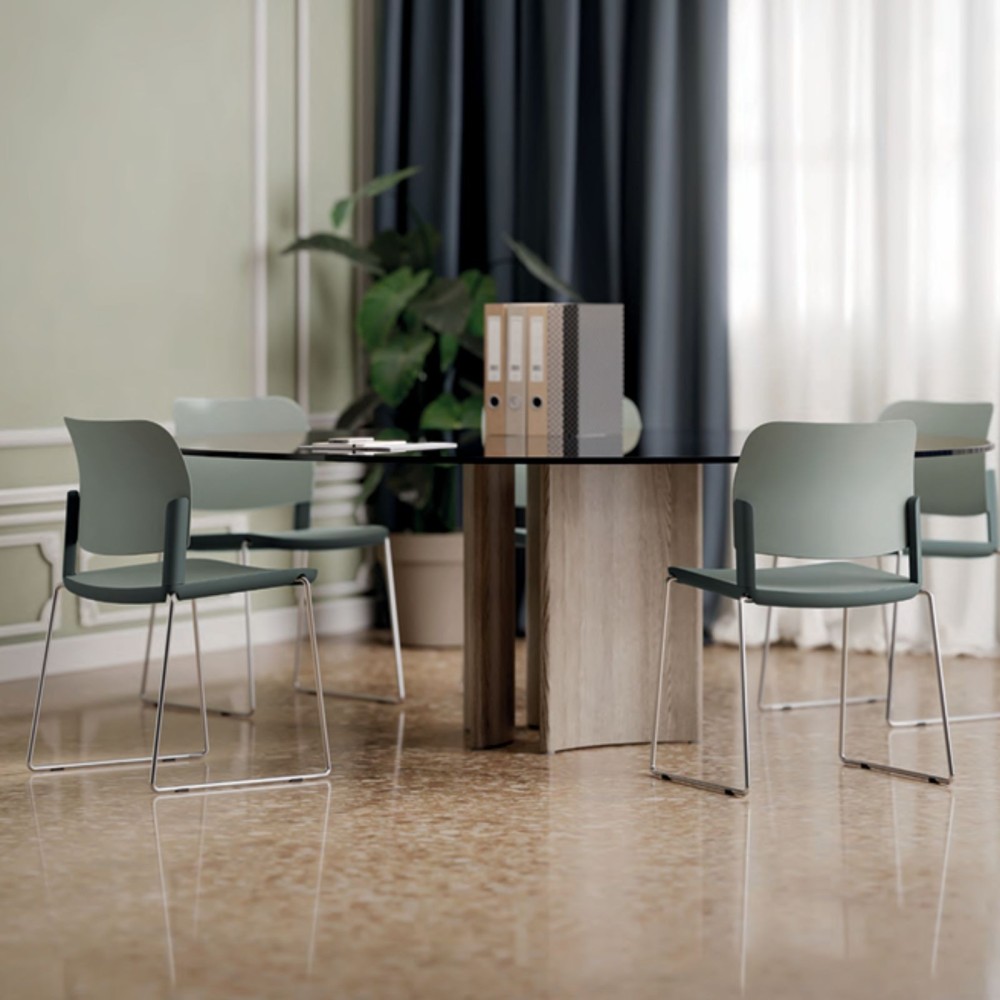 Le piètement luge en acier tubulaire confère à la Volo une stabilité naturelle et une présence maîtrisée dans l’espace. Cette structure continue facilite l’alignement des chaises autour des tables de réunion et participe à une organisation visuelle ordonnée, sans rupture de ligne.