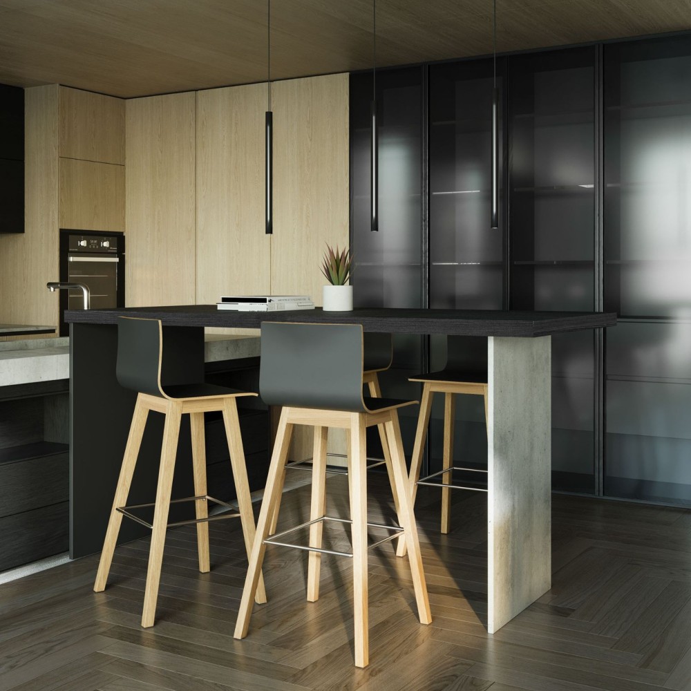 Chaise haute dédiée aux tables et comptoirs d’environ 1100 mm de hauteur.