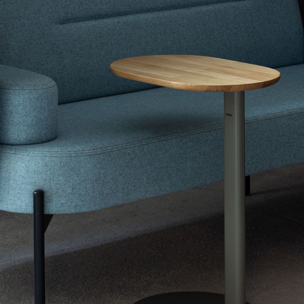 Le plateau ovale en chêne plaqué biseauté (épaisseur 19 mm) apporte une touche chaleureuse et naturelle à l’ensemble. Sa surface de 480 × 320 mm offre suffisamment d’espace pour poser un ordinateur portable, des documents ou des accessoires du quotidien.