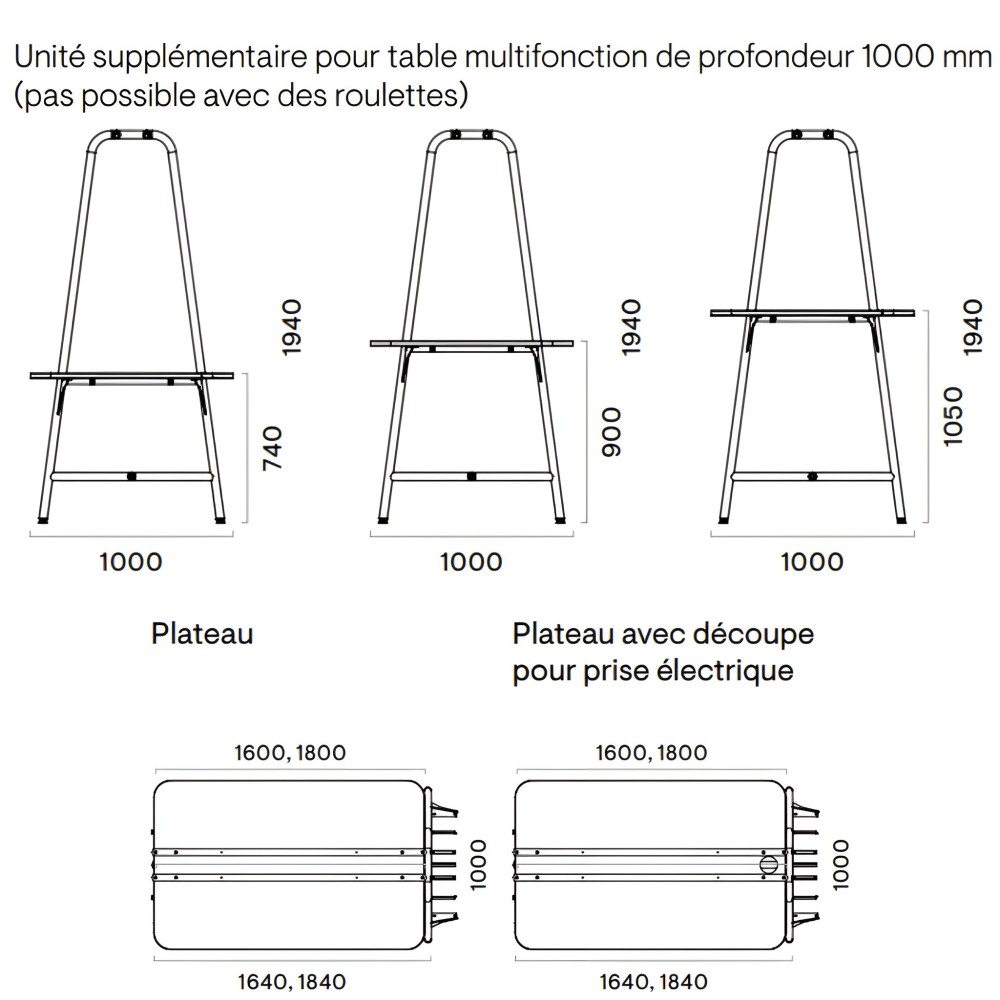La table ROUND Multipurpose se décline en plusieurs hauteurs (740, 900, 1050 mm) et longueurs (1600, 1800 mm), avec ou sans découpes pour les blocs de prises. Elle peut être équipée de modules supplémentaires pour agrandir la surface de travail à mesure que l’équipe s’agrandit.