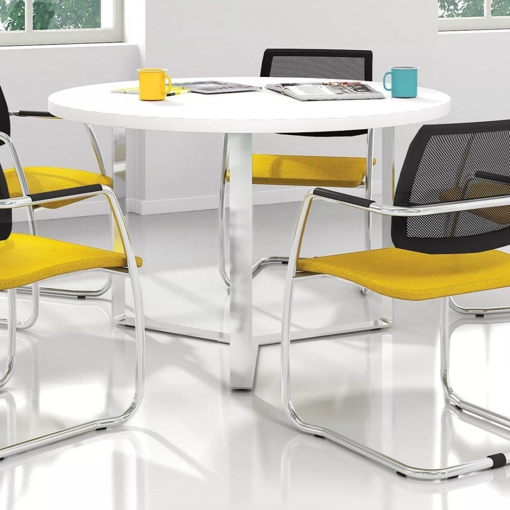 La table de réunion PLANA en version ronde est idéale pour les espaces de direction, les zones d’accueil ou les petites salles de réunion. Son design épuré allie un plateau en bois clair chaleureux à un piètement moderne en acier plié blanc.