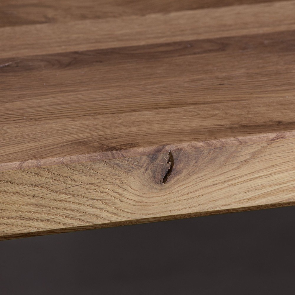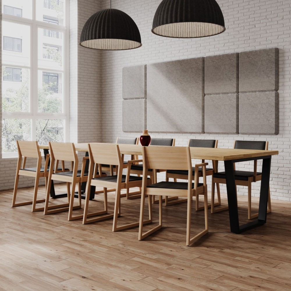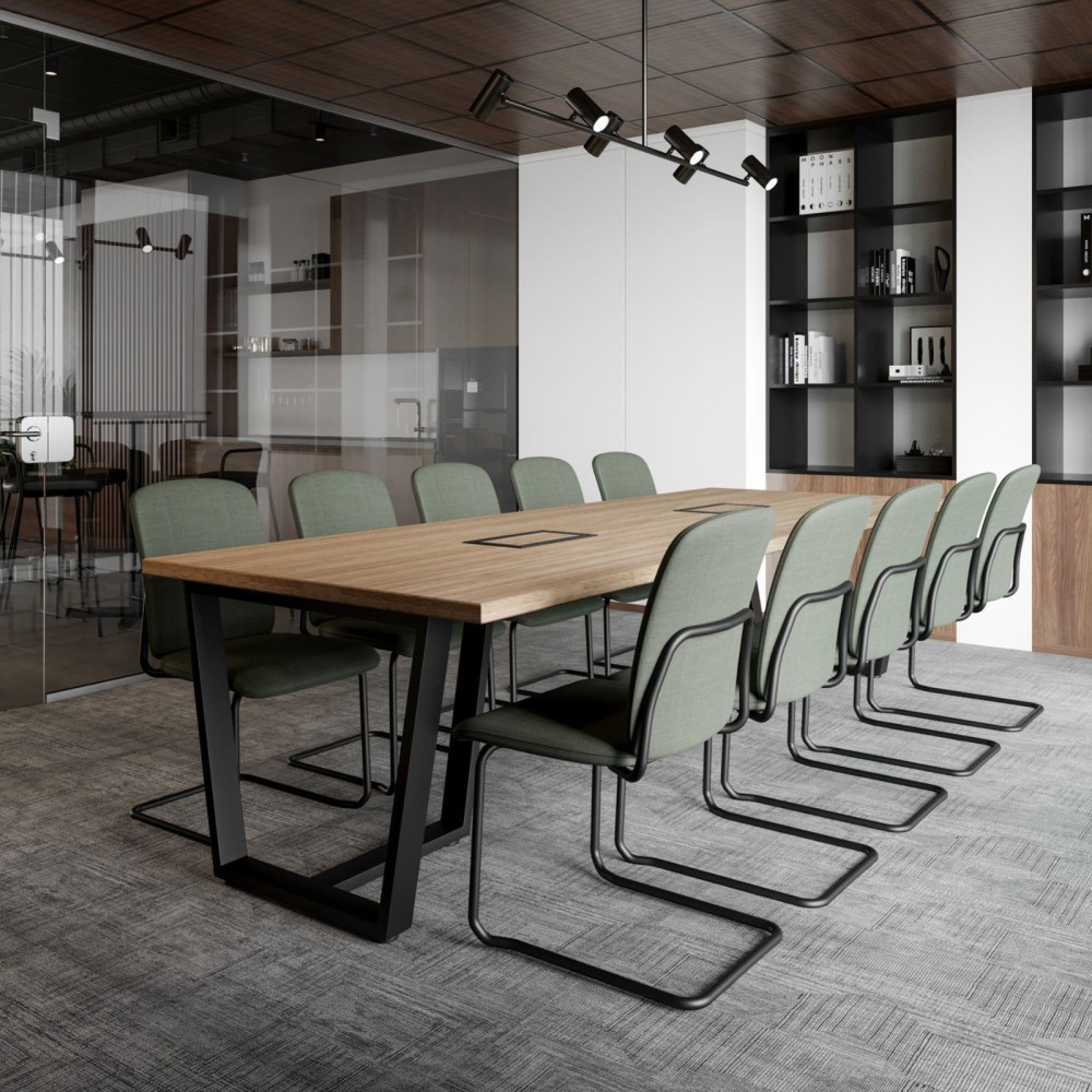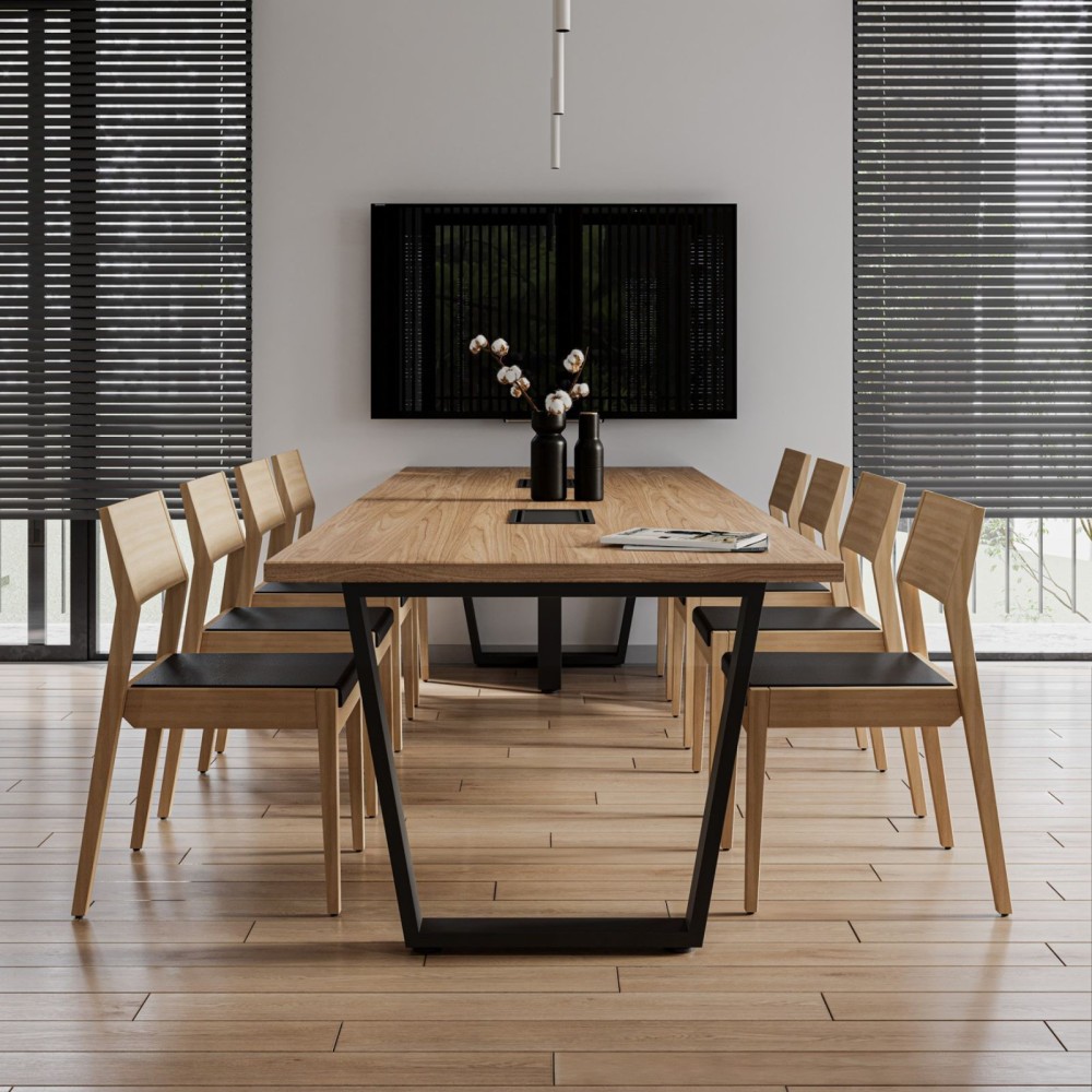 Le plateau en bois massif offre une surface de travail robuste et agréable au toucher. Chaque table possède un veinage unique qui met en valeur le caractère naturel du chêne et apporte une atmosphère chaleureuse à l’espace de réunion.